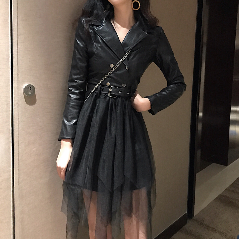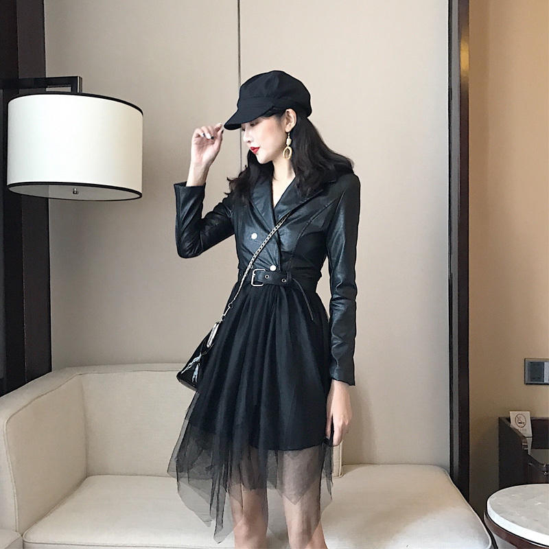/ 2018新款時尚港味氣質女人味外套皮衣拼接網紗假兩件連衣裙秋裝女