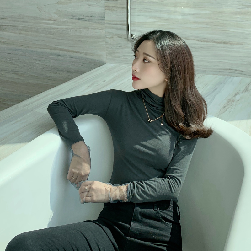 韓版chic早秋針織衫2018新款百搭拼紗高領打底衫長袖套頭毛衣女潮