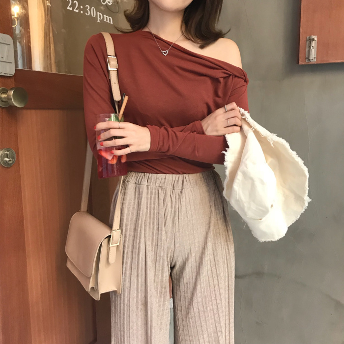 早秋純色修身氣質斜領露鎖骨小心機性感百搭港味復古一字肩上衣女