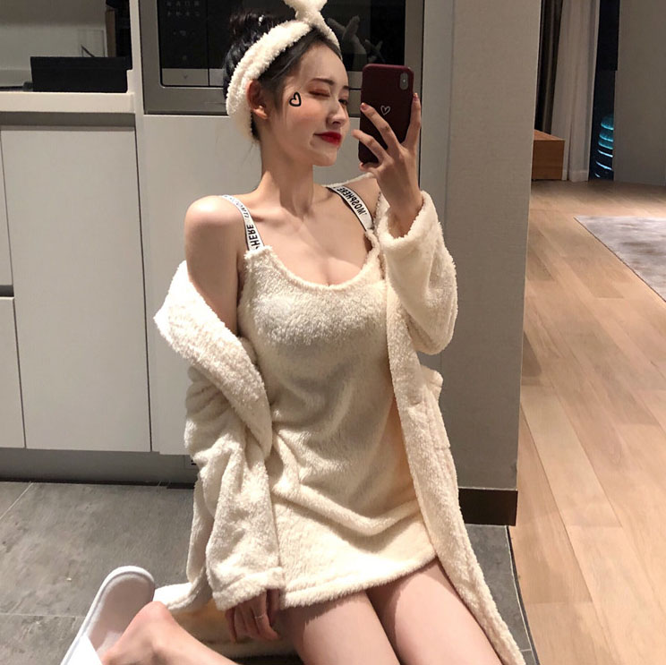 復古性感睡衣女神套裝秋冬2018新款外套+吊帶發帶保暖純色家居服