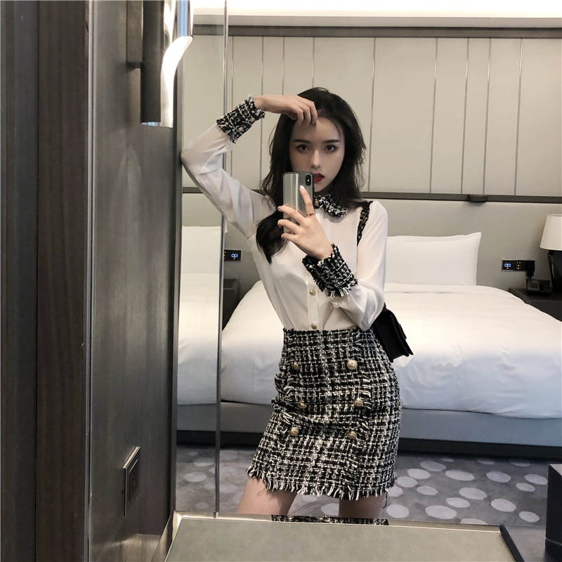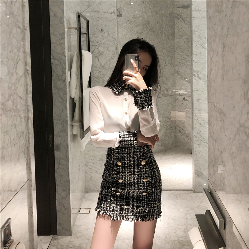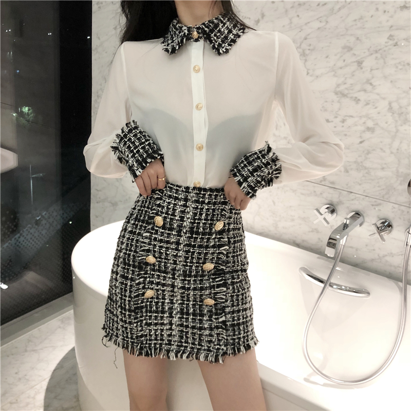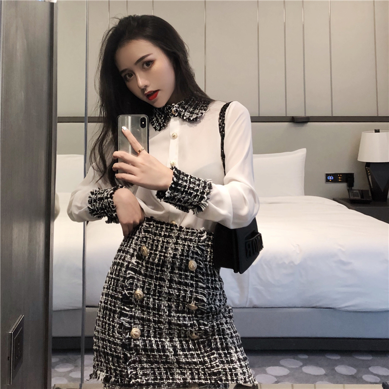 / 港味套裝女秋新款小香風洋氣毛呢拼接襯衫排扣毛呢短裙chic兩件套