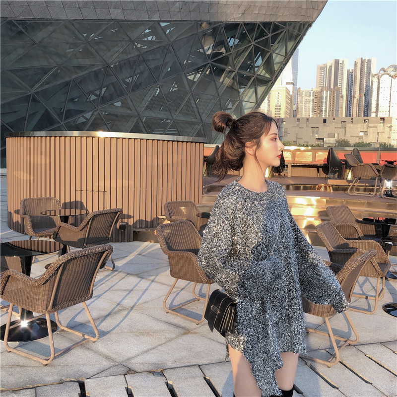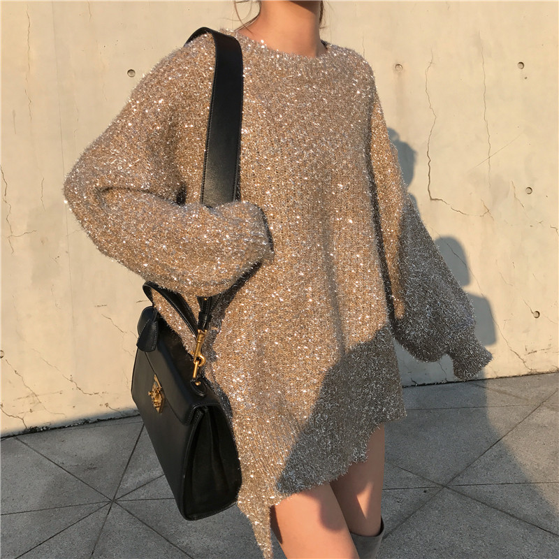 復古氣質中長款上衣女慵懶風時尚百搭chic秋季不規則寬松閃閃毛衣