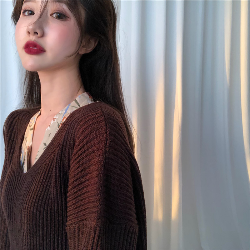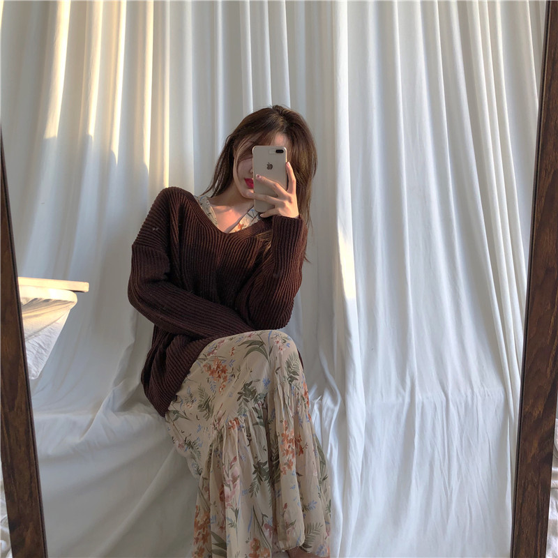 / 新款港風復古chic時尚套裝V領針織暖軟糯毛衣復古碎花收腰連衣裙