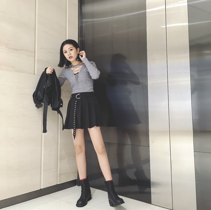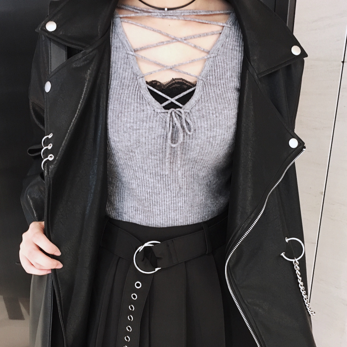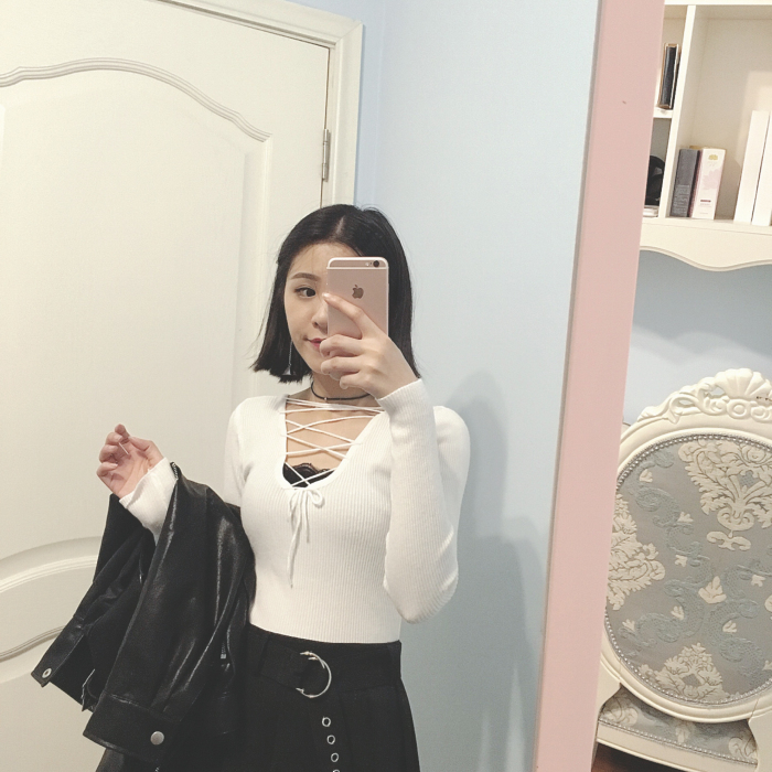 復古港風chic前后兩穿交叉綁帶v領顯瘦性感打底針織衫修身上衣女