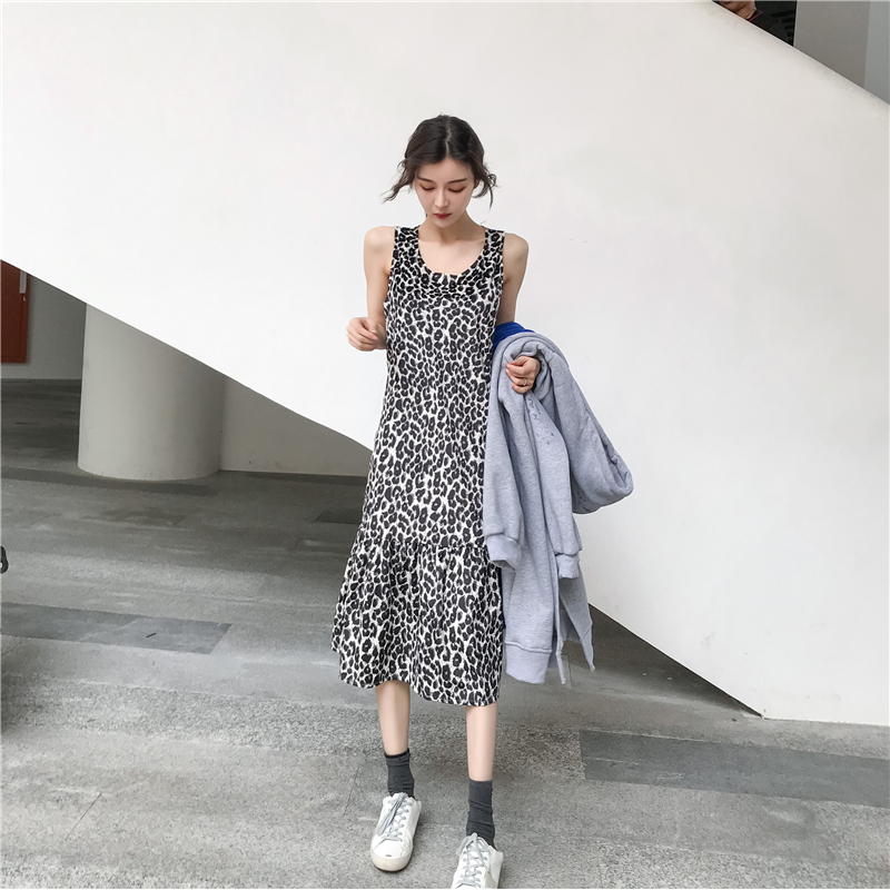 港味復古寬松中長款加絨連帽長袖衛衣+韓版豹紋百搭裙子