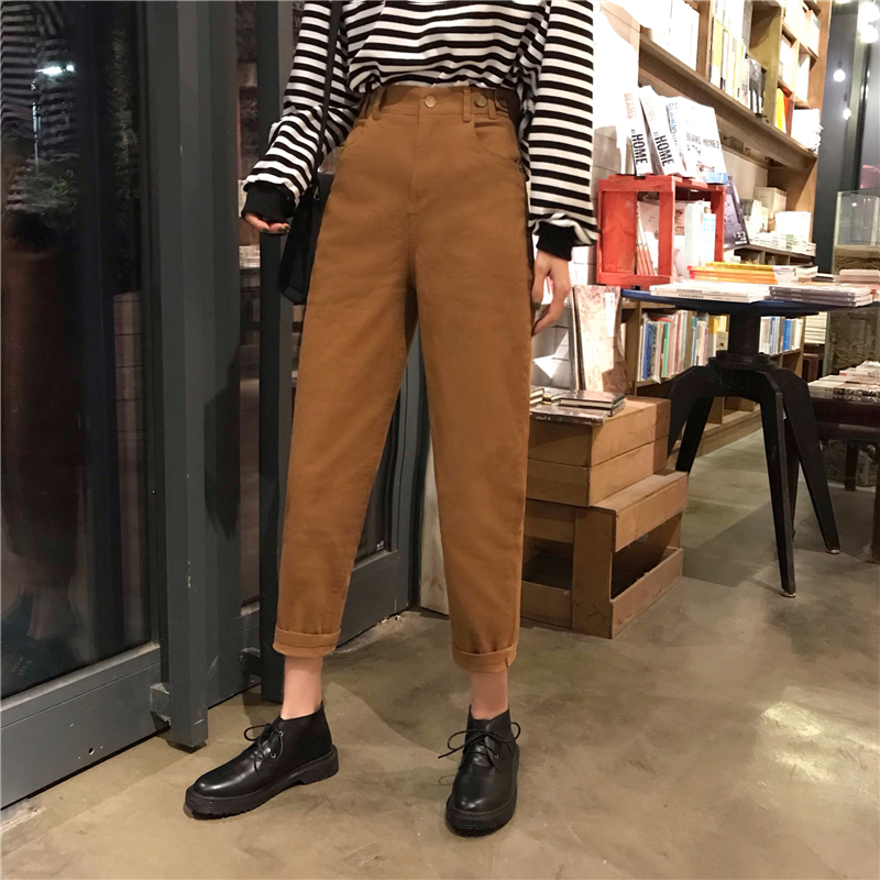 / 韓版褲子秋冬2018新款加厚高腰寬松九分老爹褲哈倫牛仔褲女~三色