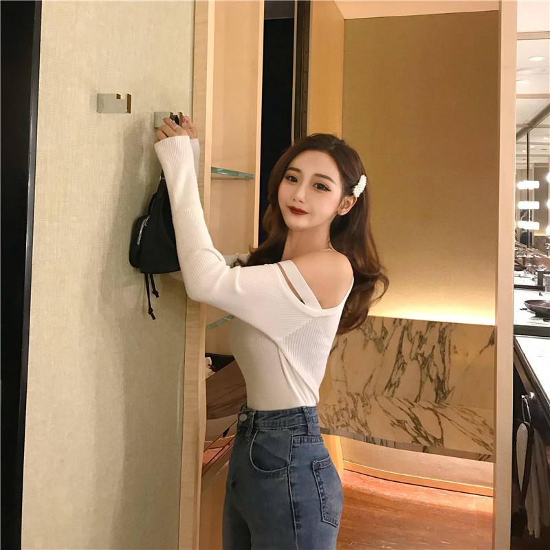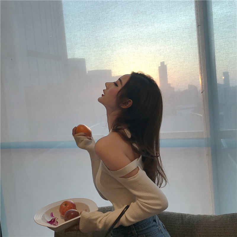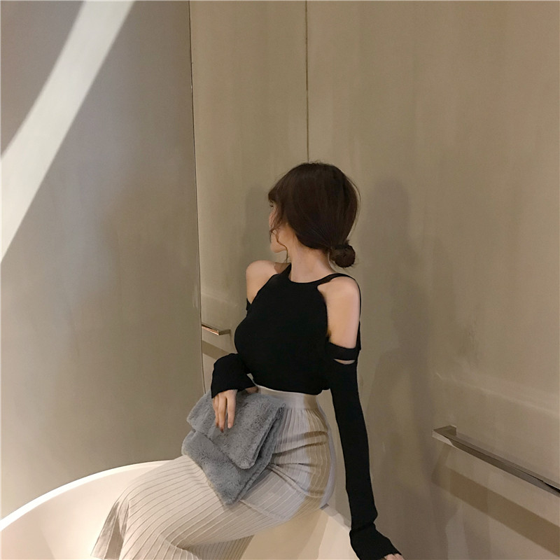 / 復古秋季新款韓版小心機上衣女裝設計感修身顯瘦雙露肩吊帶針織衫