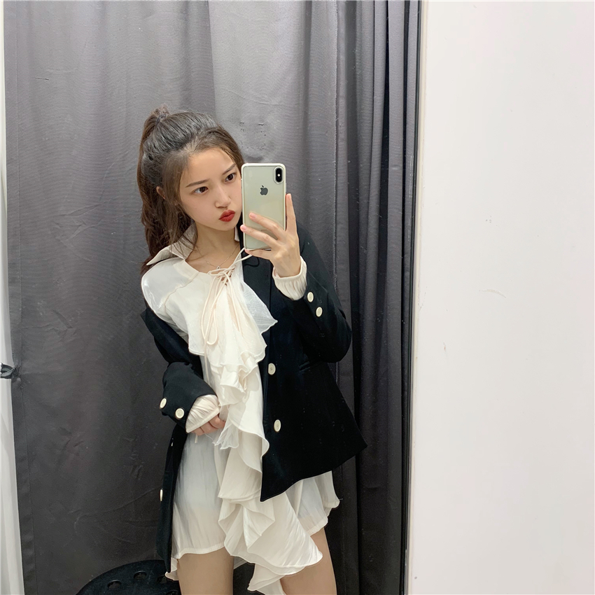 慵懶風秋裝女2018新款復古夾克牛仔外套女春秋+純色V領吊帶連衣裙