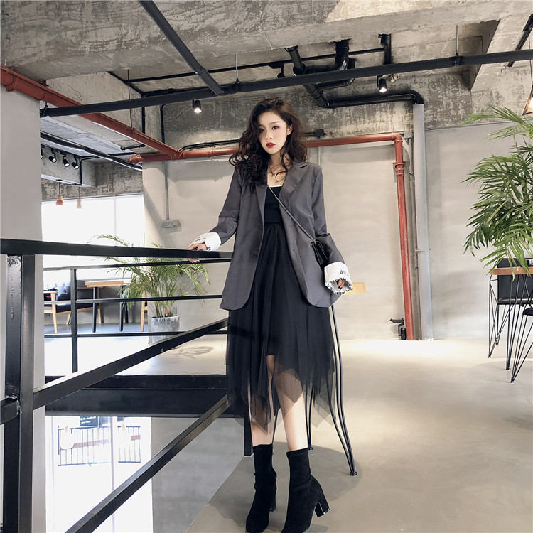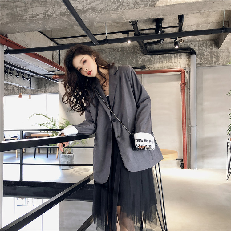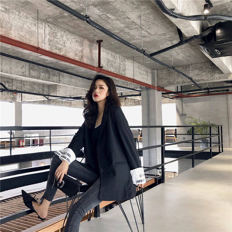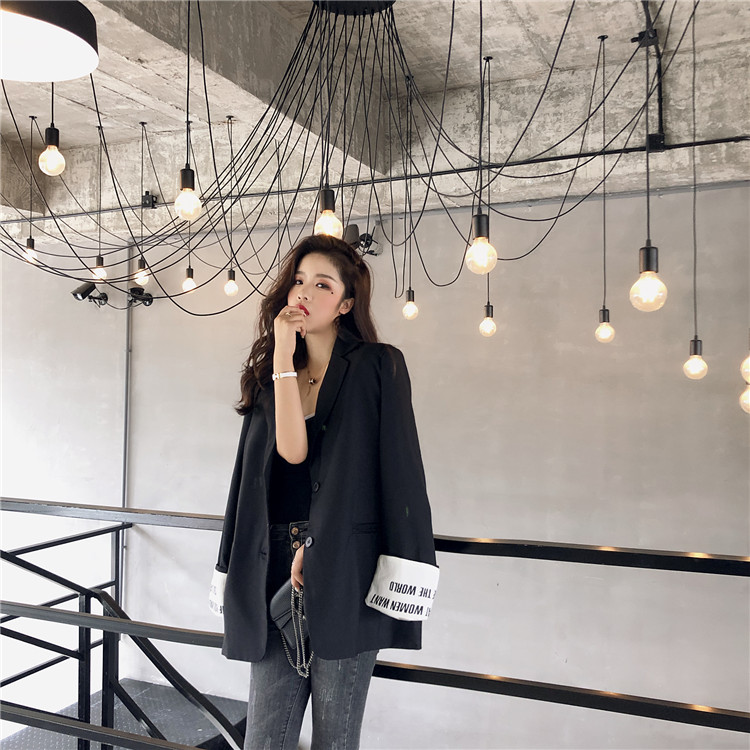 / 港風秋季時髦英倫風寬松復古chic氣質顯瘦拼色袖口英文西裝外套女