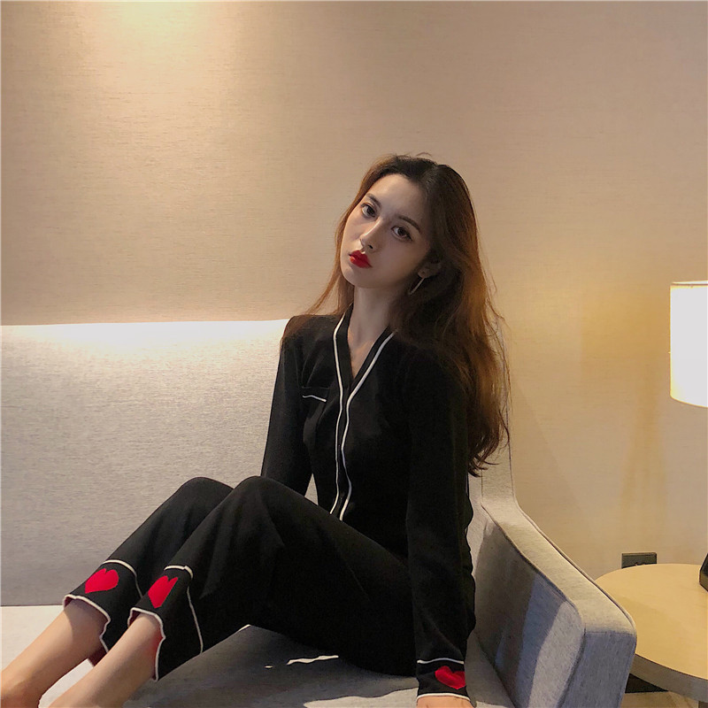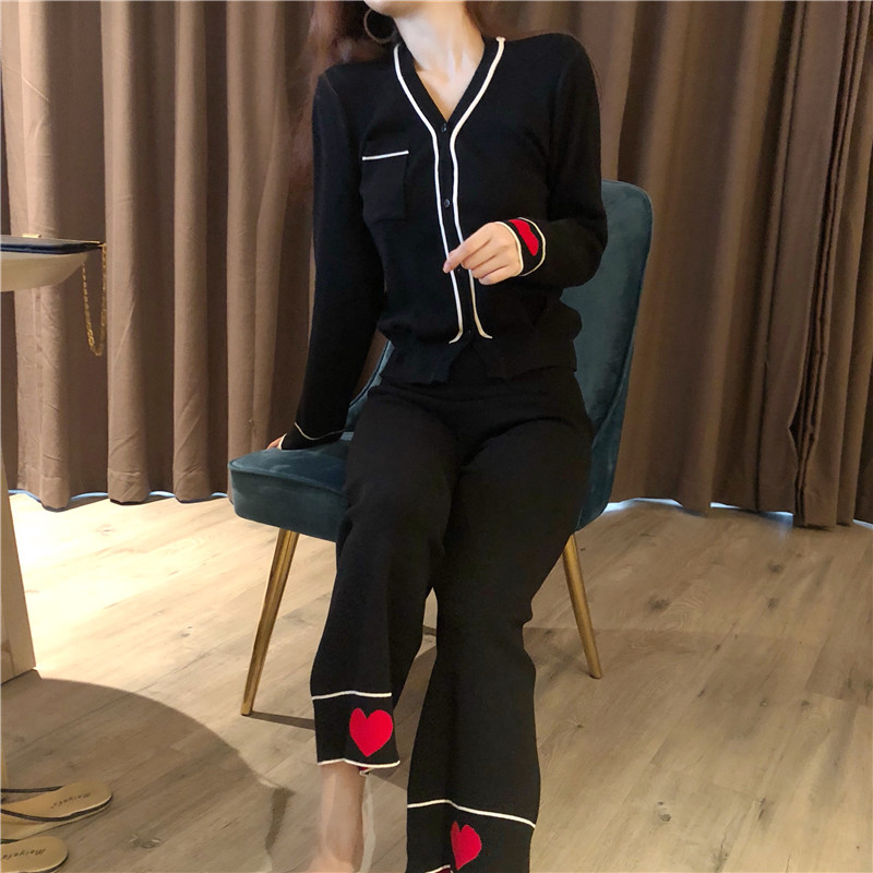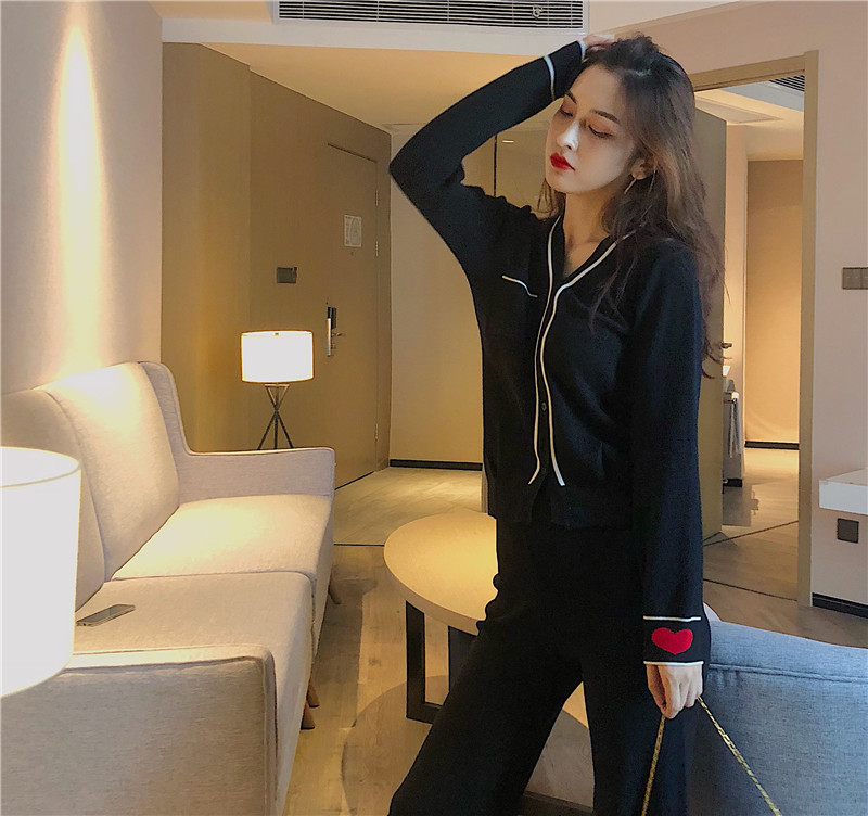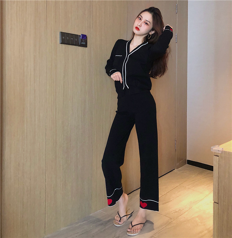 / 港味新款睡衣風帥氣Bf針織套裝兩件套長袖V領襯衫高腰直筒褲女潮