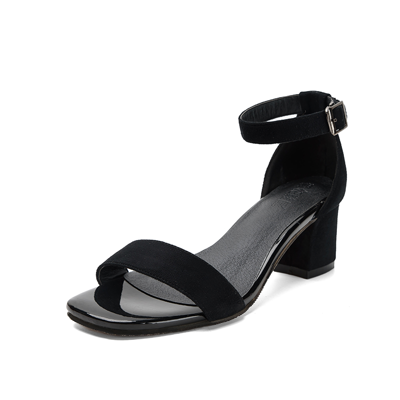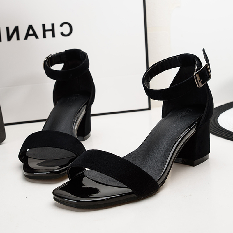 / 涼鞋女夏新款一字扣帶黑色百搭學生露趾歐美中跟粗跟高跟女鞋