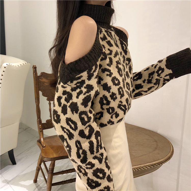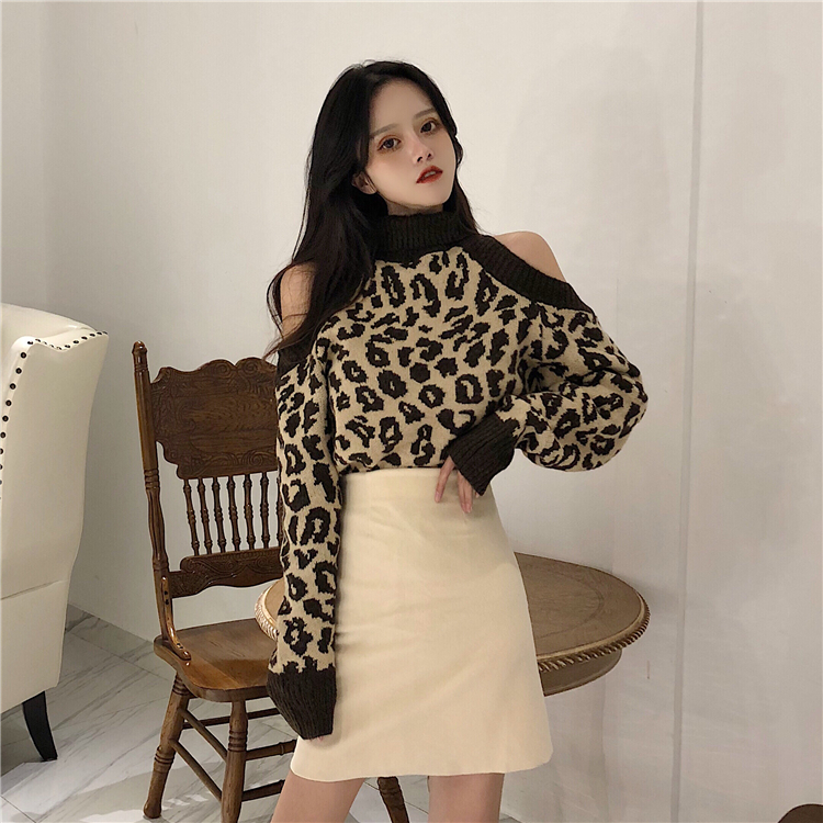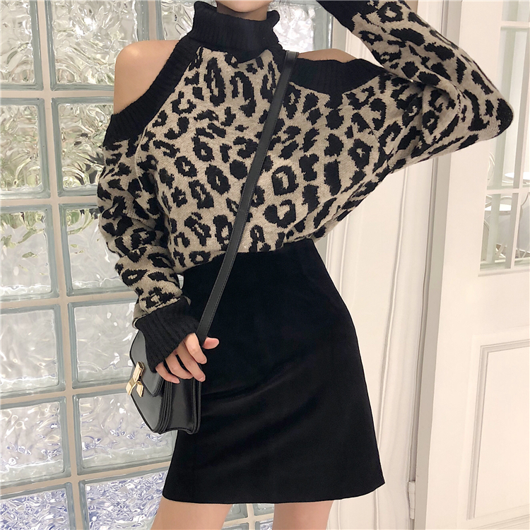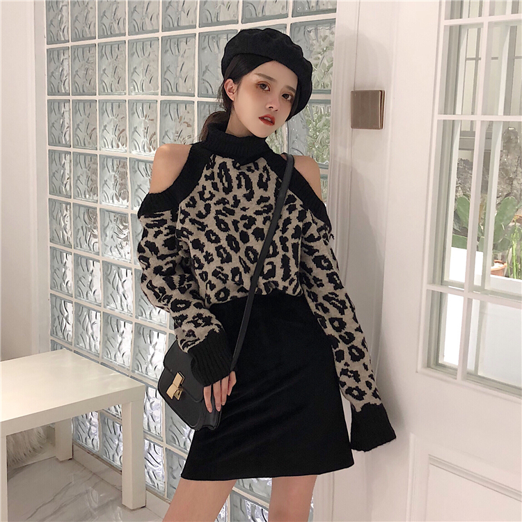 / 韓版秋冬新款時尚套裝露肩豹紋針織上衣高腰半身裙chic兩件套女潮