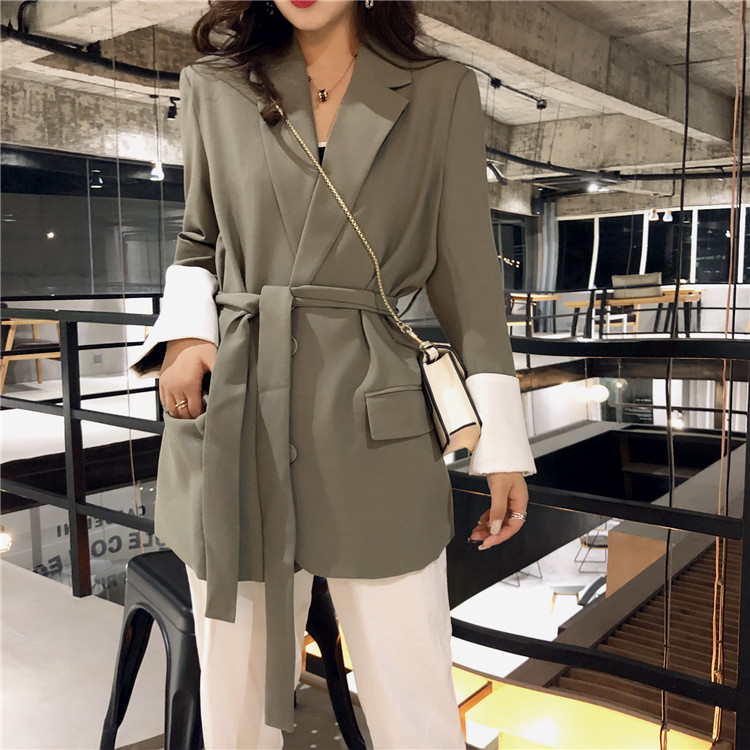 / 小香風2018韓版時尚chic秋季新款氣質拼色系帶顯瘦純色西服領外套