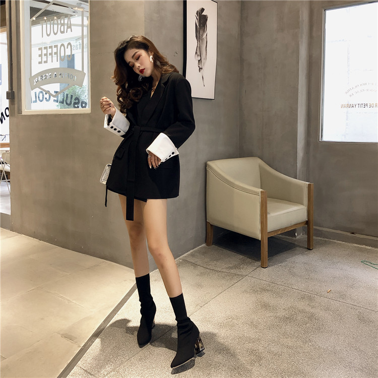 小香風2018韓版時尚chic秋季新款氣質拼色系帶顯瘦純色西服領外套