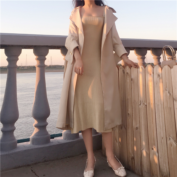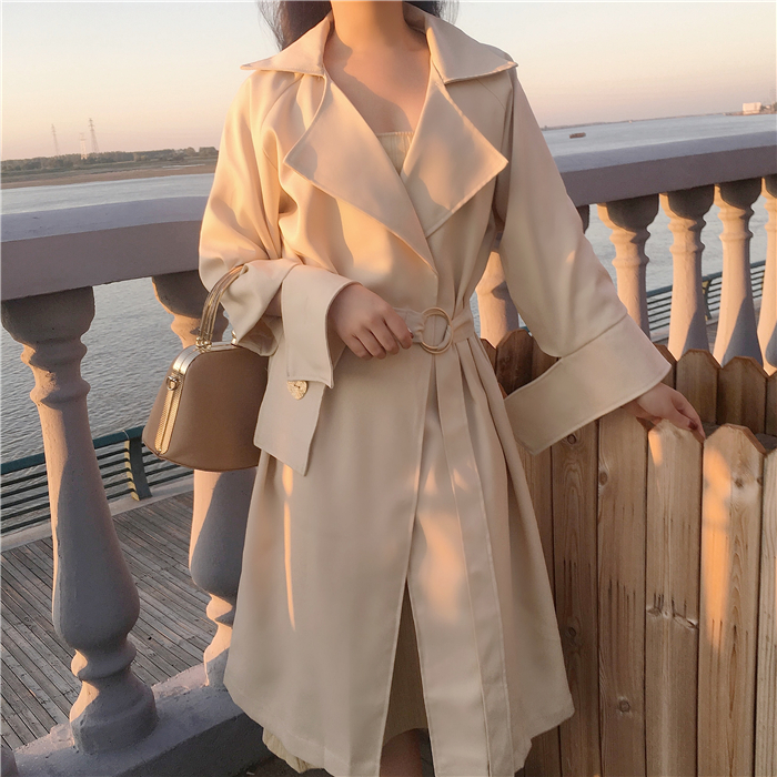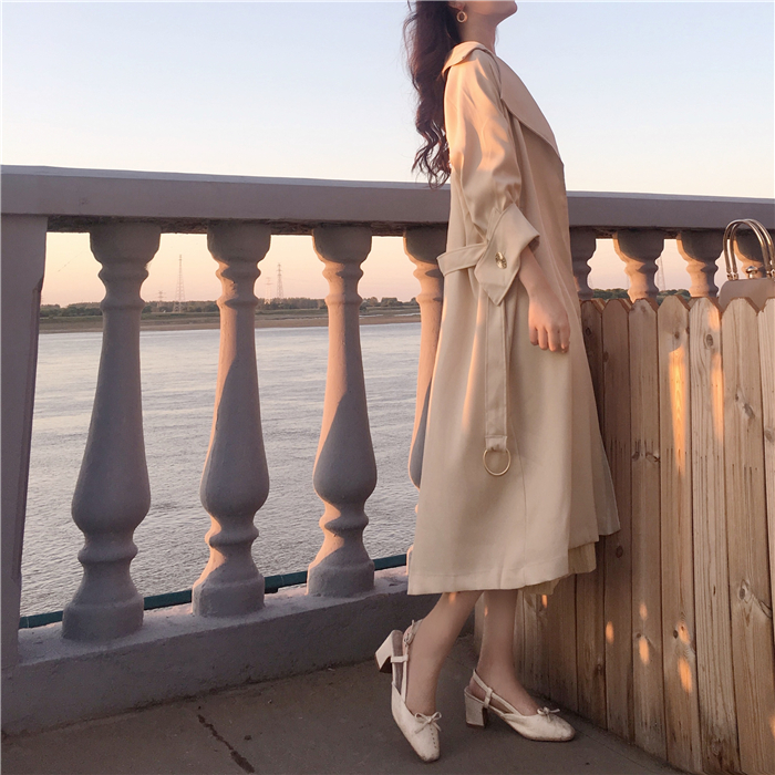 / 韓版復古chic女小香風時尚翻領氣質大袖子系帶收腰中長款風衣外套