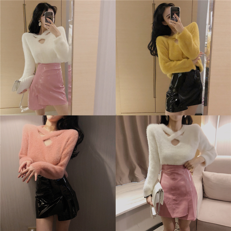 百搭韓版慵懶掛脖鏤空上衣時尚套裝高腰不規則PU皮裙小性感兩件套