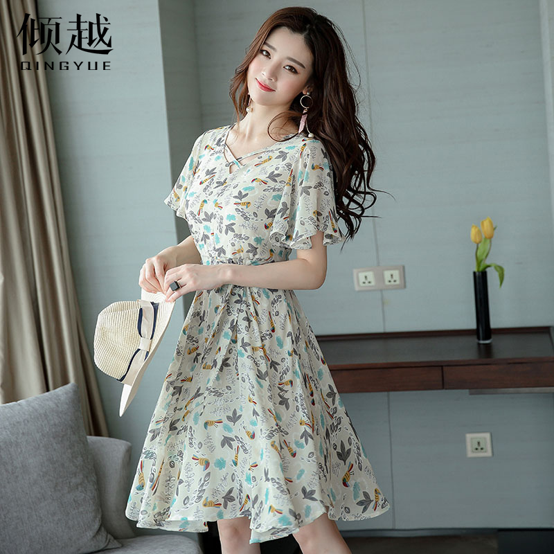 中腰荷葉袖2017夏季新款氣質短袖X型褶皺中長款時尚碎花連衣裙潮