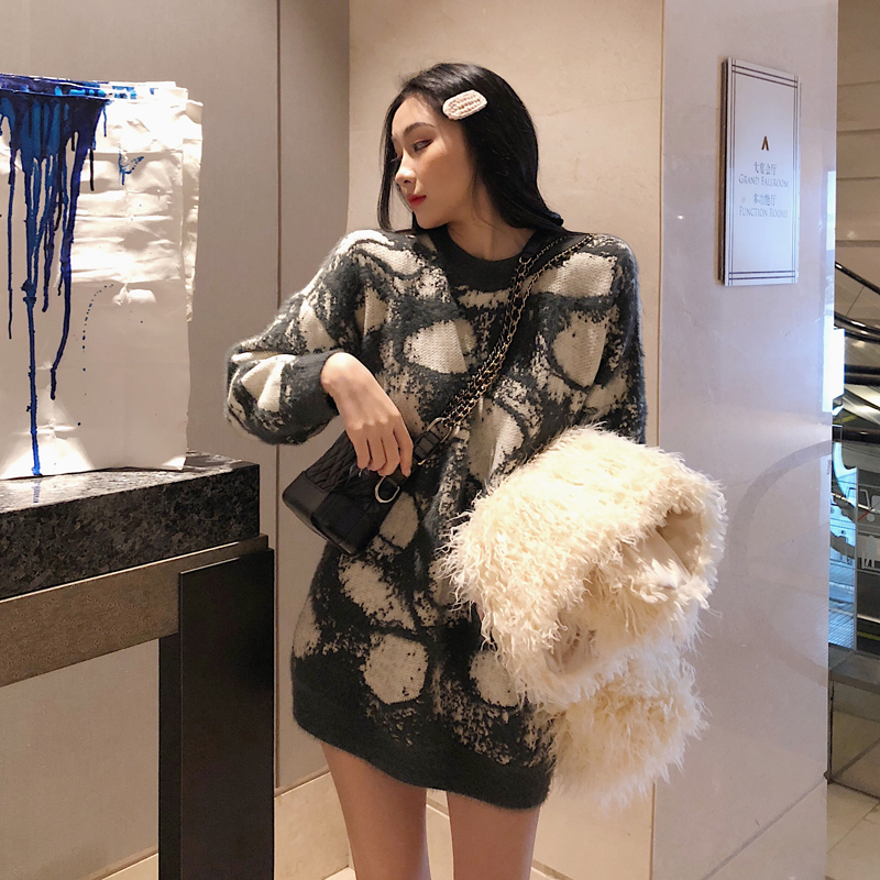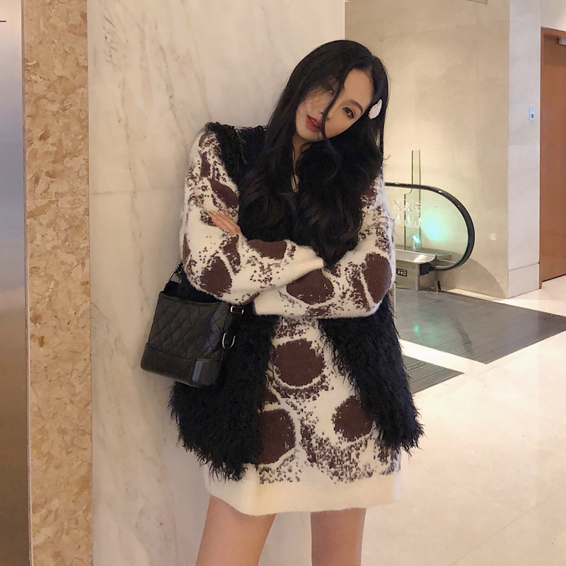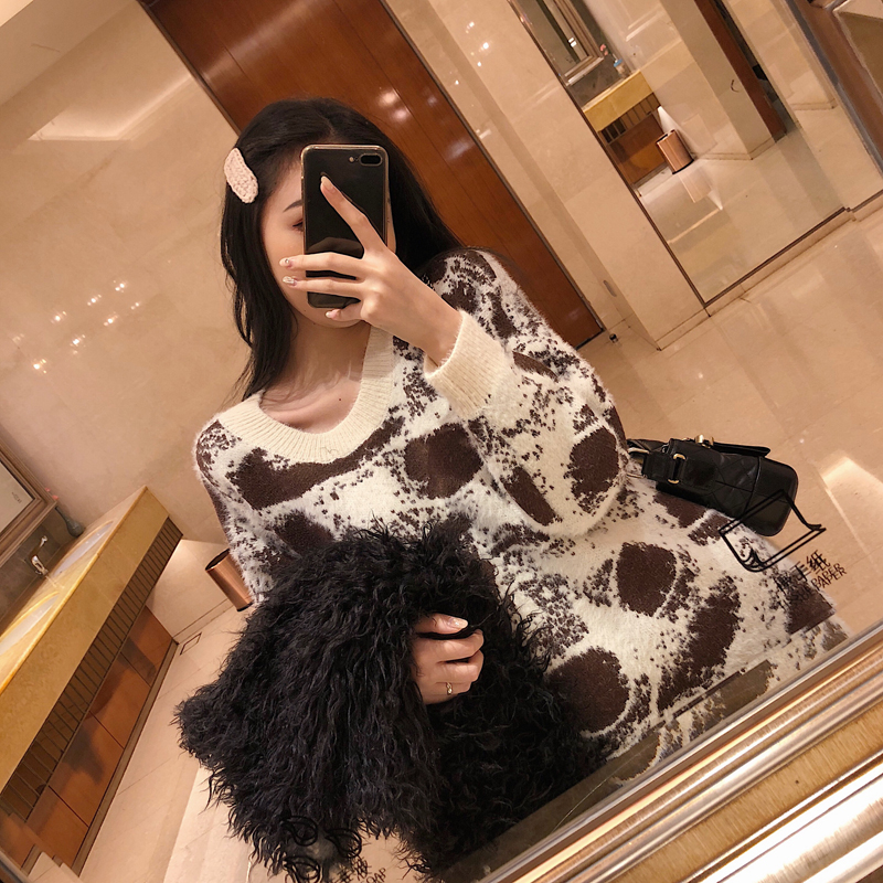 / chic慵懶寬松仿水貂絨中長款豹紋毛衣女秋冬2018新款加厚長袖外套