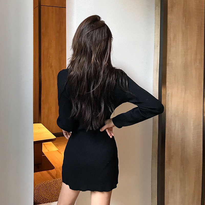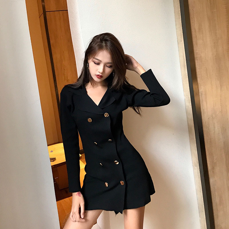 / 時尚氣質新款韓版秋季修身顯瘦V領長袖雙排扣中裙純色chic連衣裙