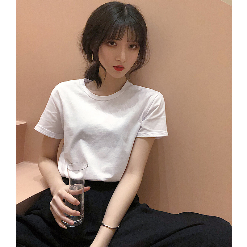 純色圓領時尚小清新學生復古chic風新款韓版百搭短袖T恤上衣潮女