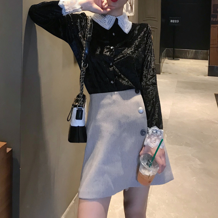 / 韓版金絲絨花邊領襯衫上衣+修身顯瘦排扣短款A字裙高腰半身裙套裝