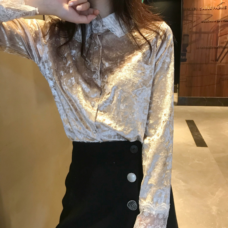 韓版金絲絨花邊領襯衫上衣+修身顯瘦排扣短款A字裙高腰半身裙套裝