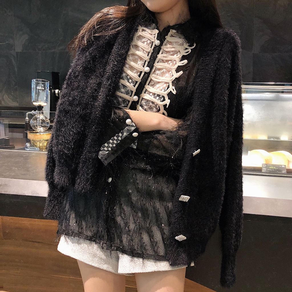 / 秋冬新款氣質修身襯衫韓版毛毛長袖百搭襯衣網紅毛衣外套開衫套裝