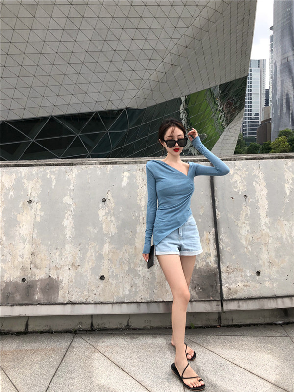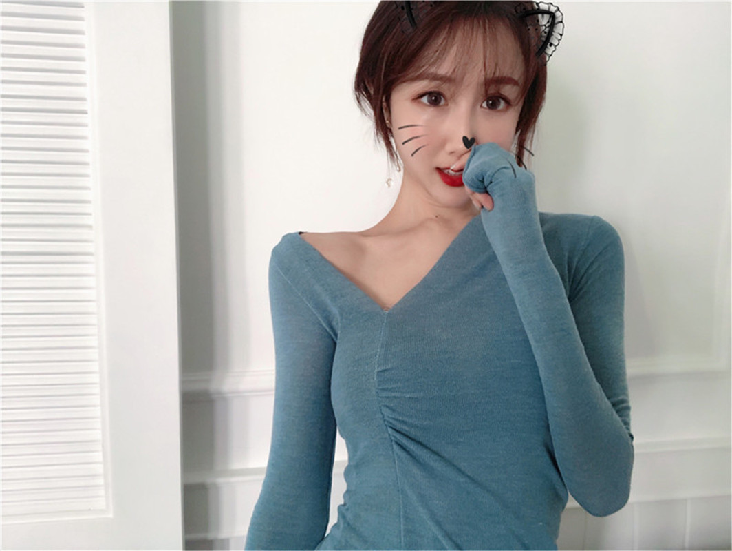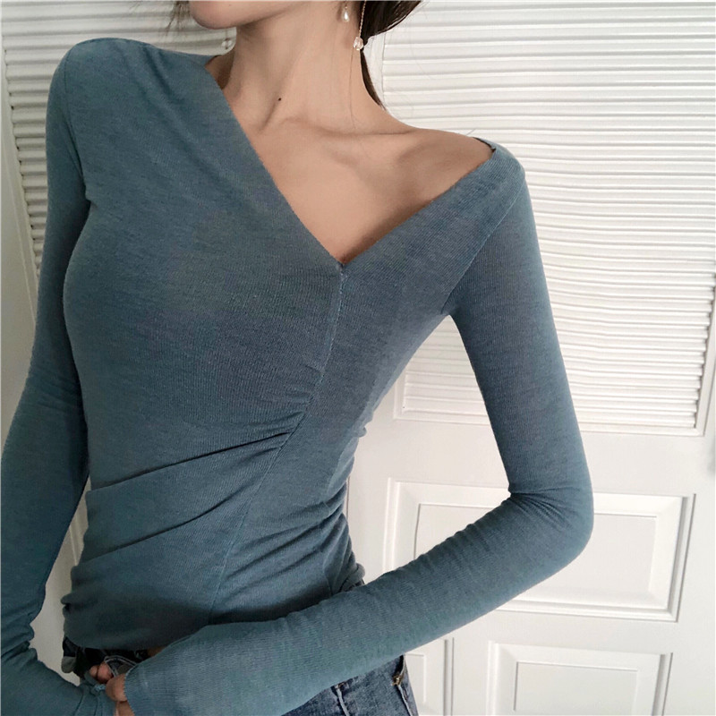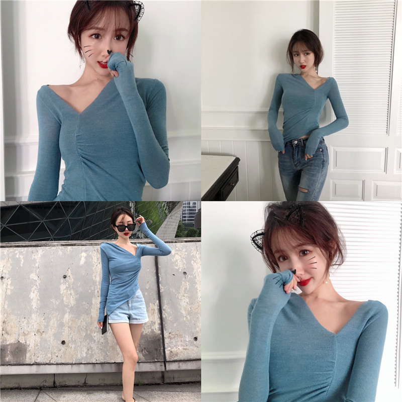 / 秋季新款顯瘦修身打底衫復古chic風T恤時尚不規則領V領針織上衣女