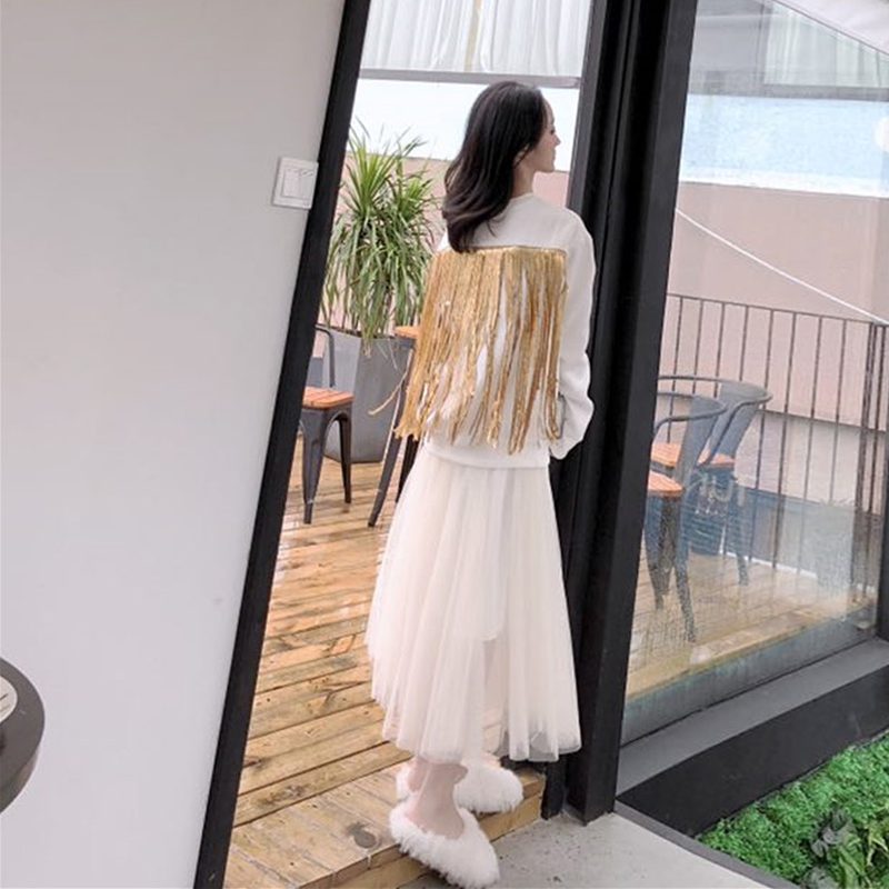 / 2018秋裝新款韓版套裝后背亮片流蘇衛衣A字網紗裙兩件套時尚女裝
