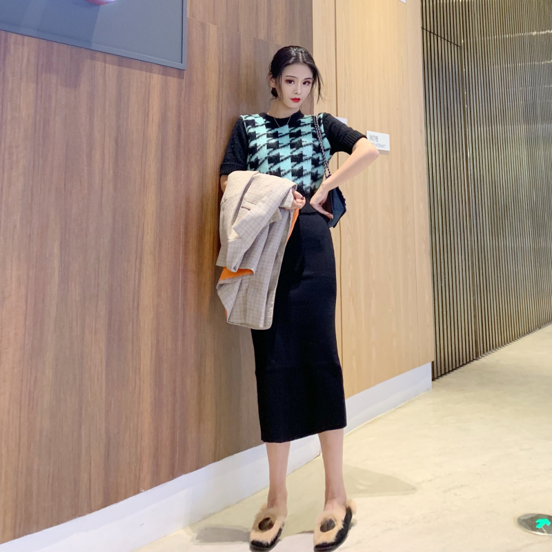 黑色打底|千鳥格毛衣|半身裙