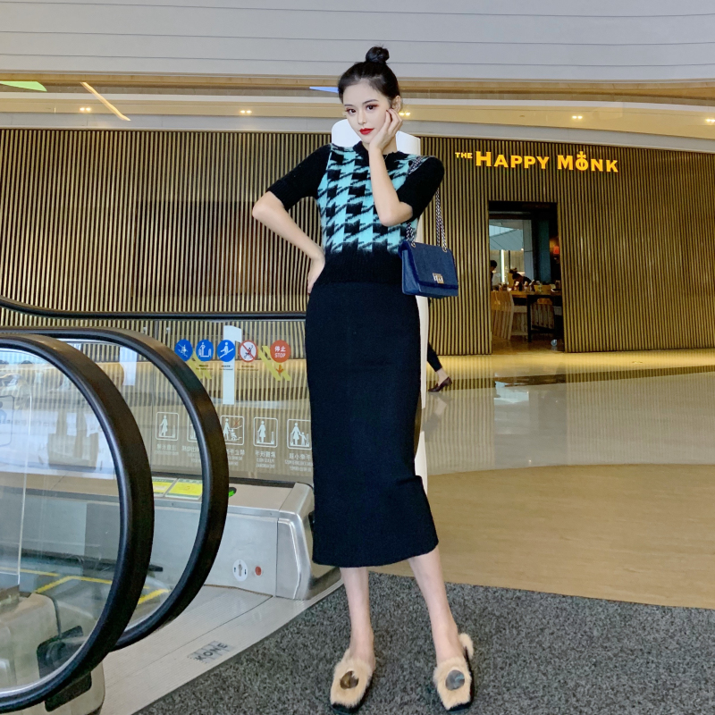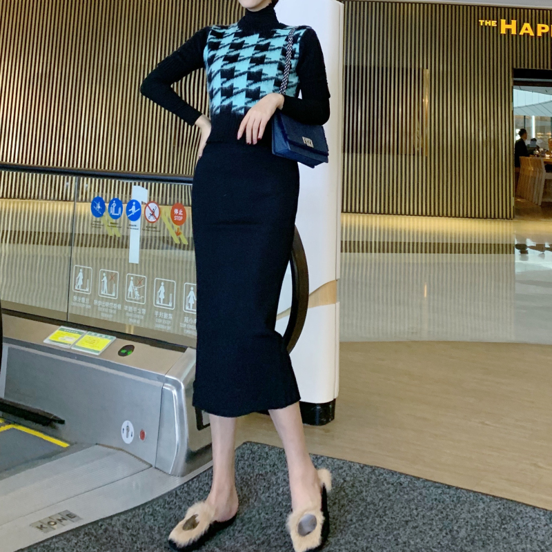 / 韓版修身高領打底衫女+馬海毛千鳥格毛衣女+半身包臀裙針織裙套裝