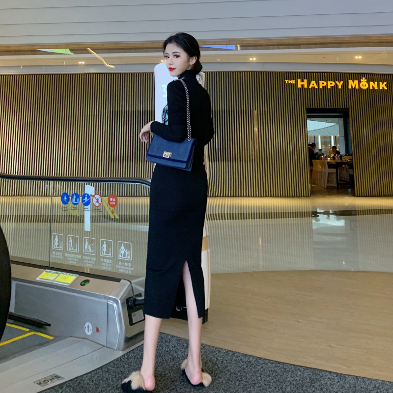 韓版修身高領打底衫女+馬海毛千鳥格毛衣女+半身包臀裙針織裙套裝