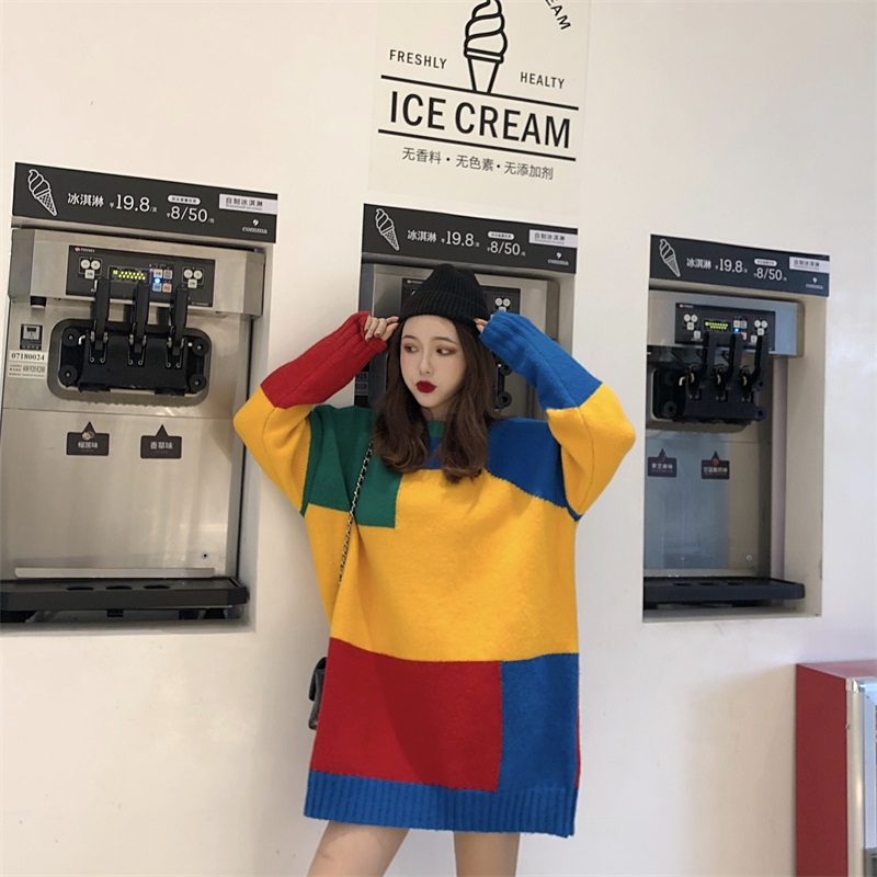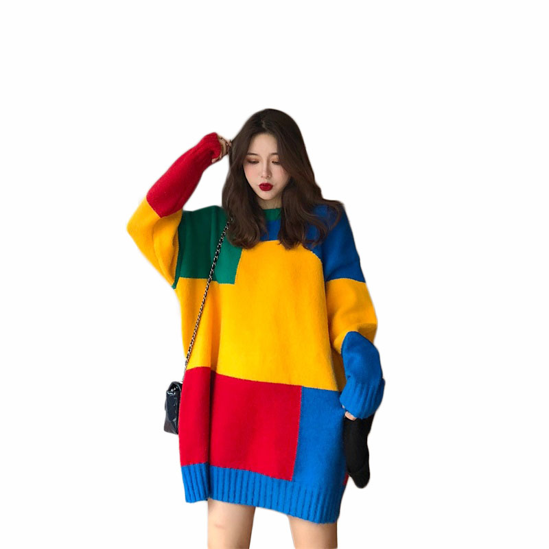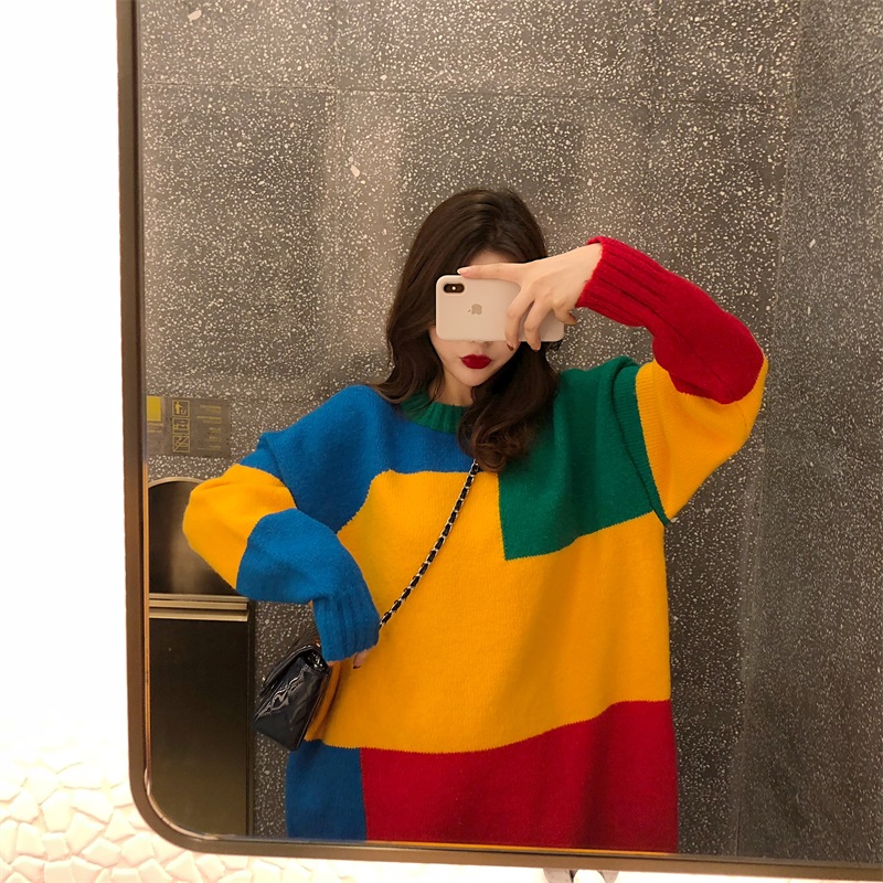 / 韓版寬松圓領長袖拼色套頭毛衣女秋冬2018新款百搭學生打底上衣潮