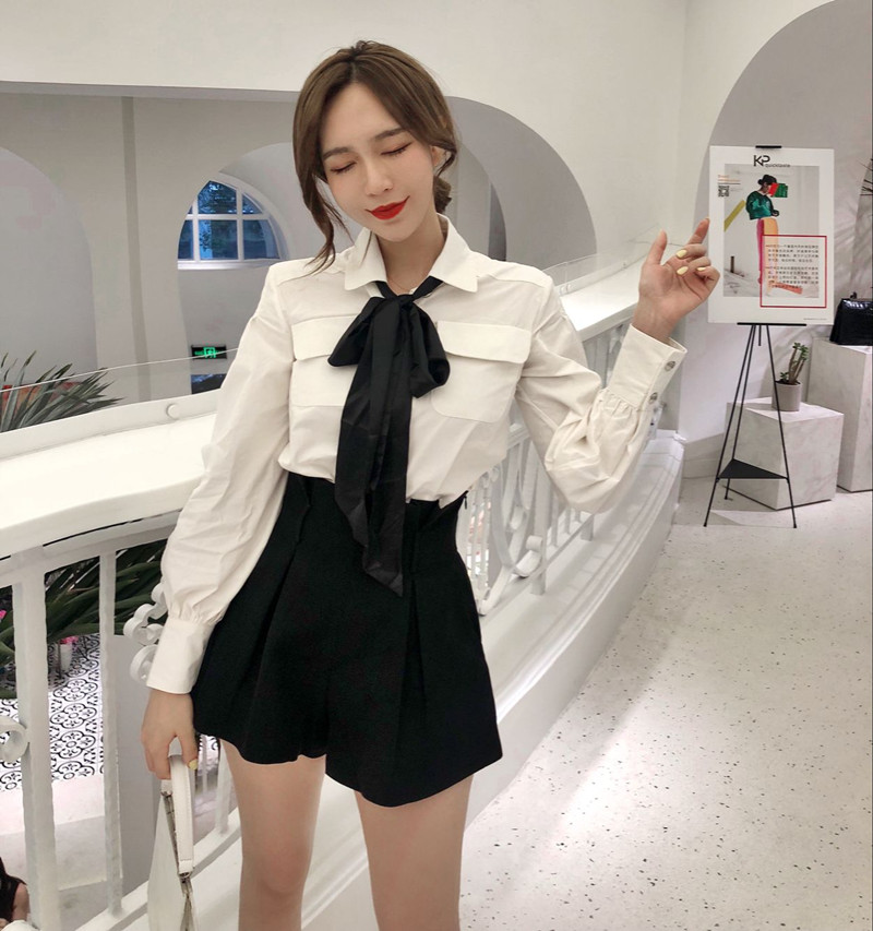 新款秋季韓版純色翻領襯衫立體剪裁闊腿高腰短褲時尚套裝女配領帶