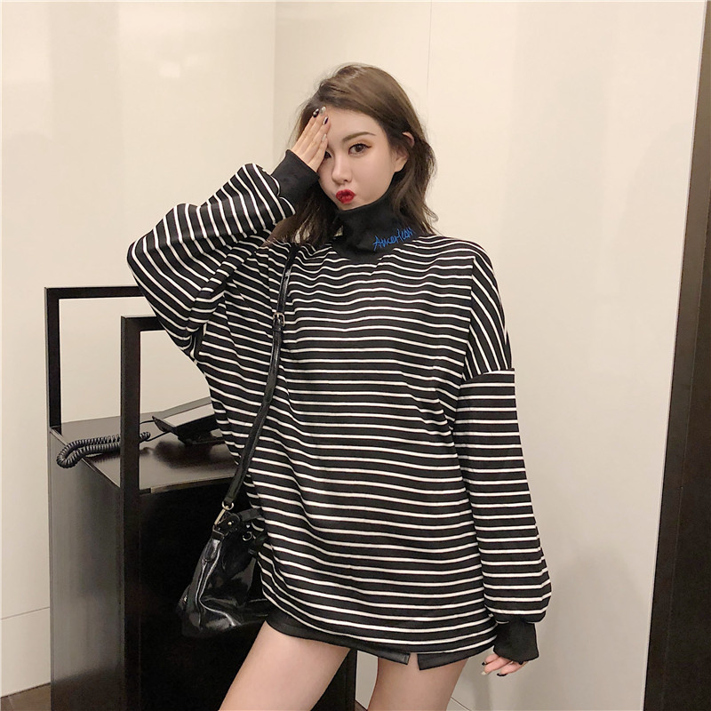 chic寬松百搭刺繡高領加厚加絨條紋套頭衛衣女秋冬2018新款上衣潮