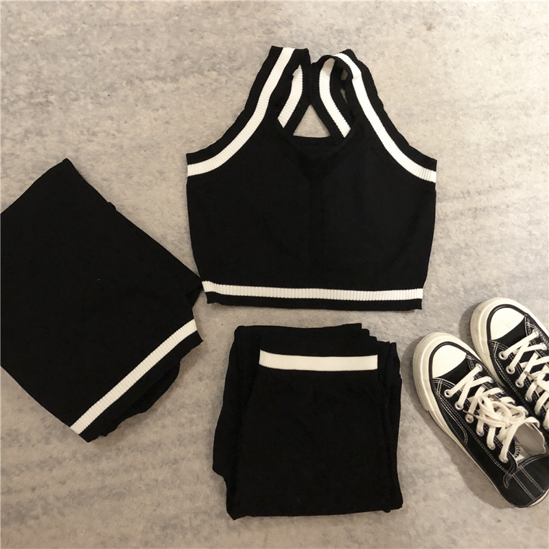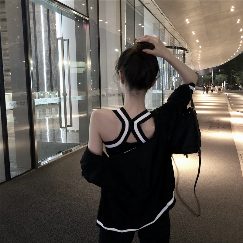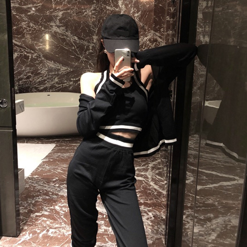 / 時尚休閑新款秋季短褲長袖開衫抹胸吊帶修身九分褲三件套運動套裝