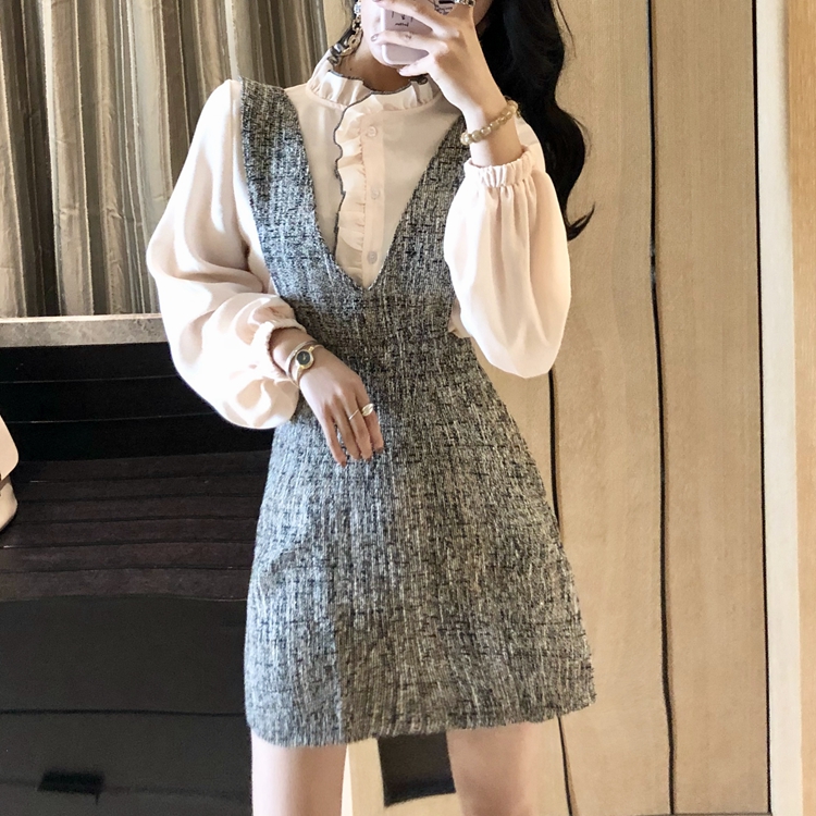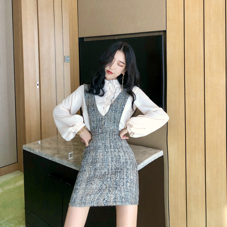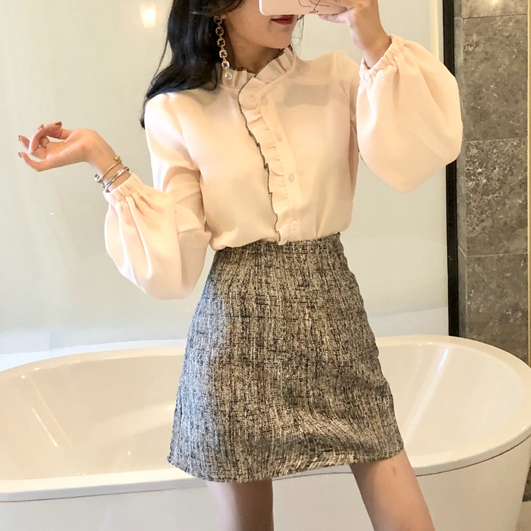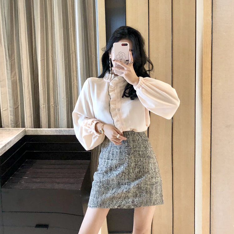 / 2018秋冬新款氣質修身長袖襯衫高腰半身裙短裙復古粗花呢背心套裝