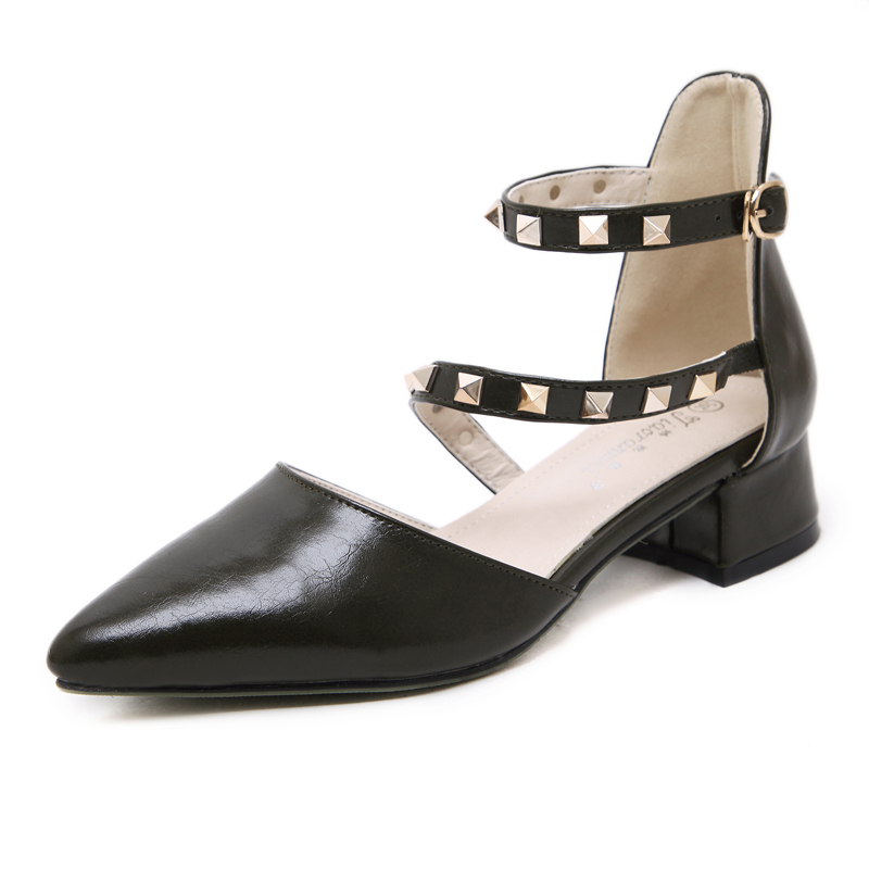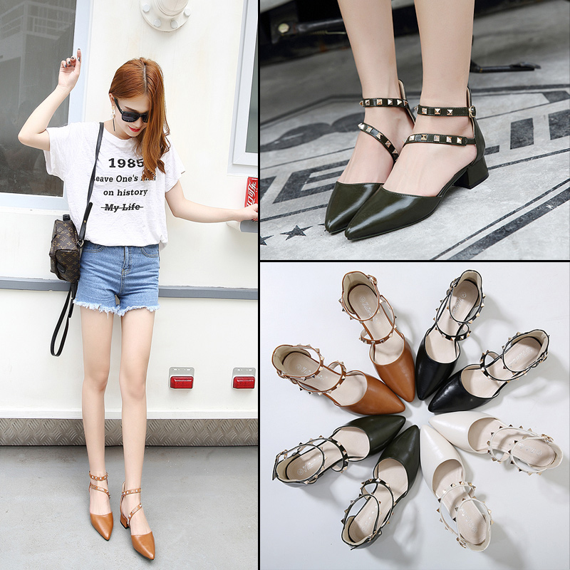 涼鞋女夏新款高跟包頭鉚釘女鞋中跟粗跟一字扣學生百搭韓版鞋
