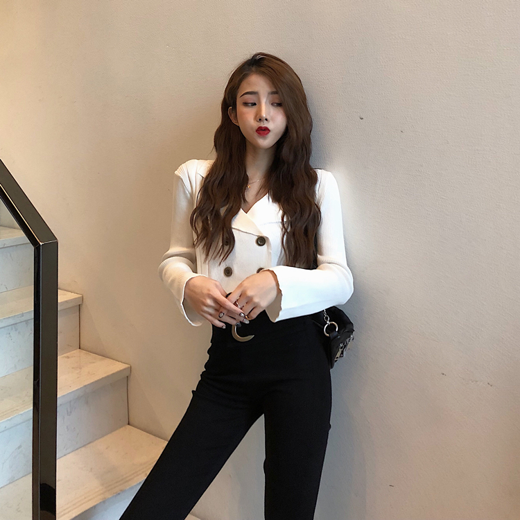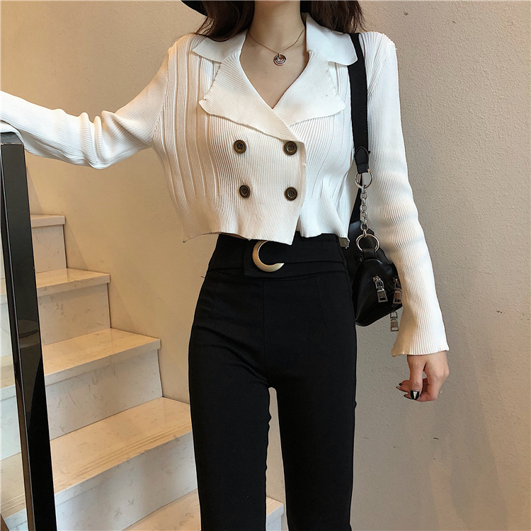 / 晚晚風網紅同款新款修身復古chic針織衫短款長袖西裝領顯瘦上衣女