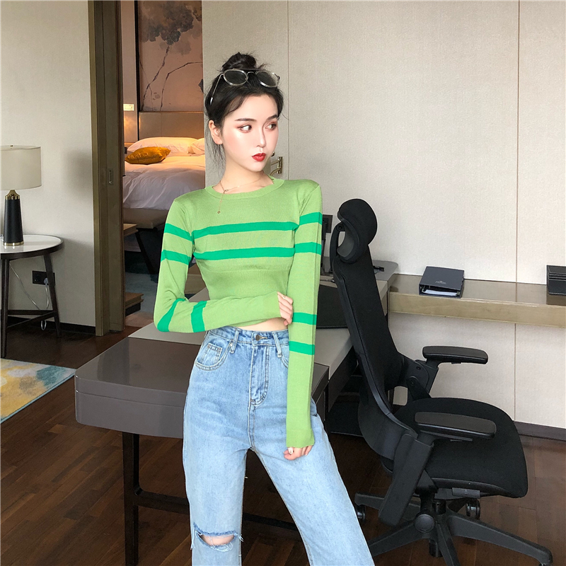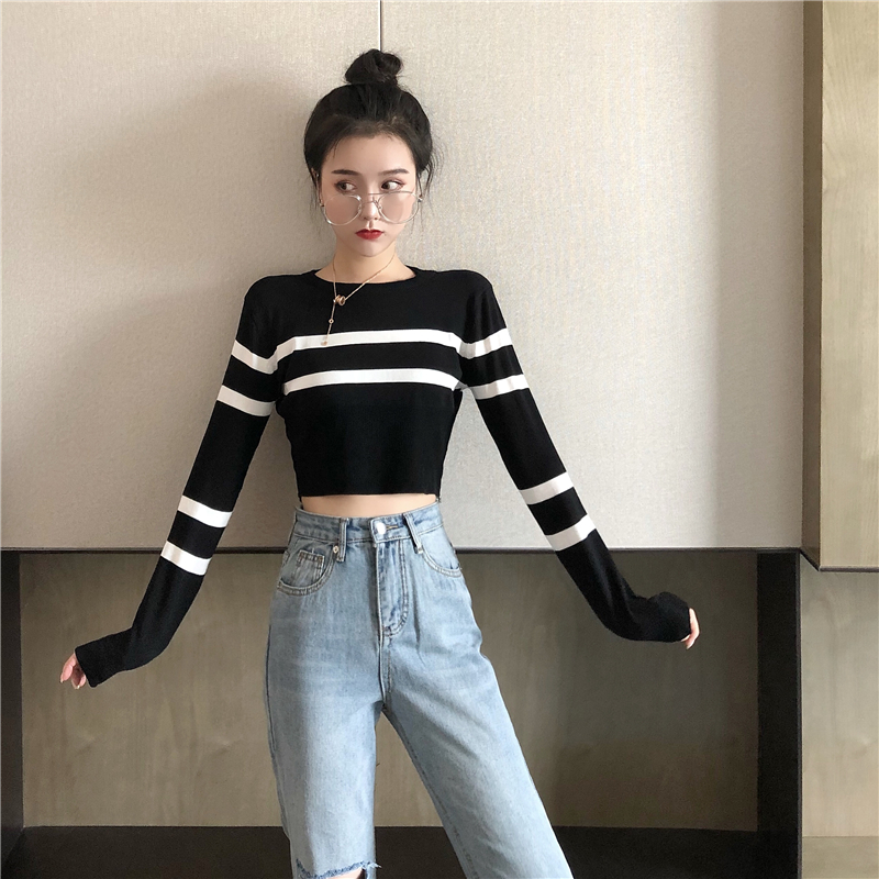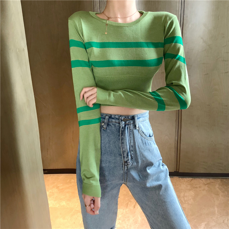 / 秋季新款復古chic時尚韓風短款修身顯瘦上衣百搭打底衫條紋針織衫