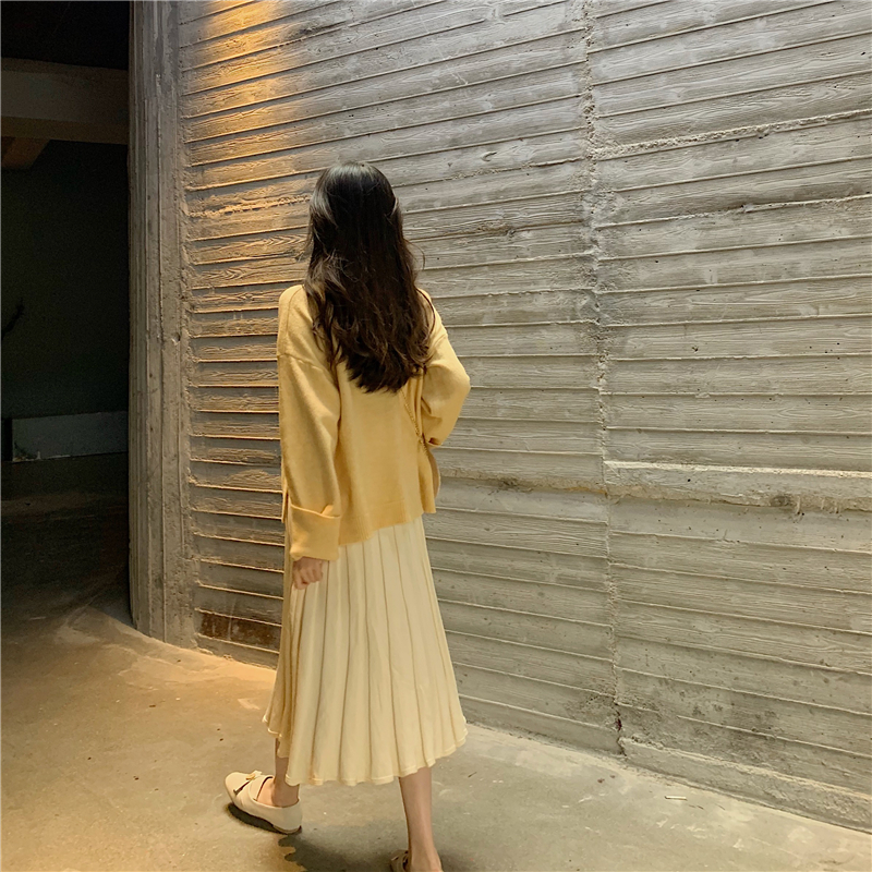慵懶寬松毛衣套頭長袖針織衫上衣+中長款高腰百褶半身