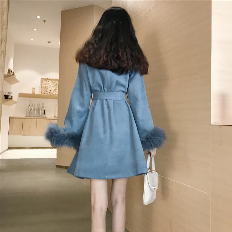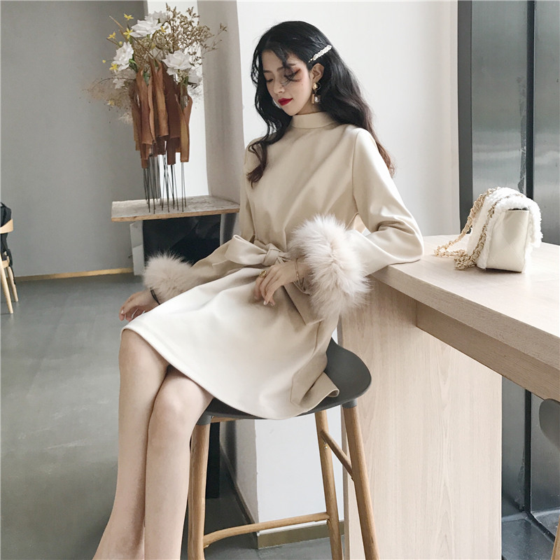 / 連衣裙女秋冬新款修身顯瘦加厚系帶收腰毛絨袖口中長款呢子半身裙
