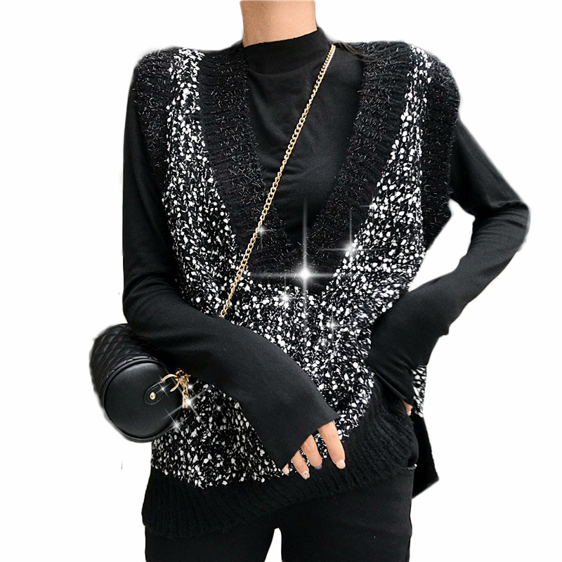 / 女神套裝秋冬慵懶寬松閃閃拼接馬甲+高腰顯瘦不規則微喇叭牛仔褲