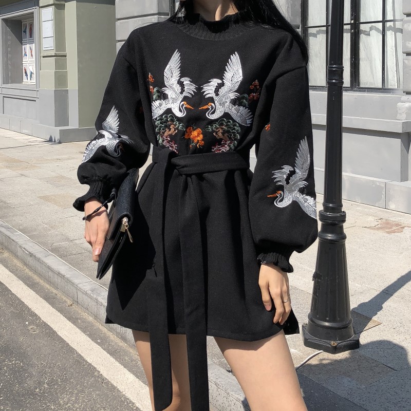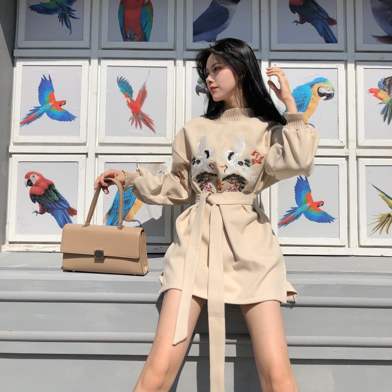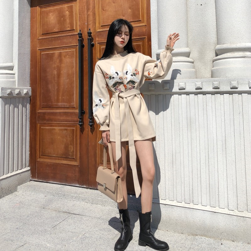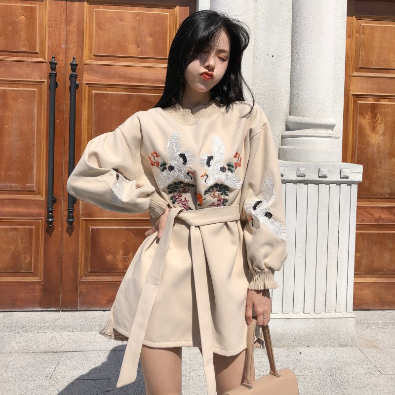 / 百搭氣質新款韓版復古chic百搭刺繡燈籠袖寬松系帶不規則連衣裙女