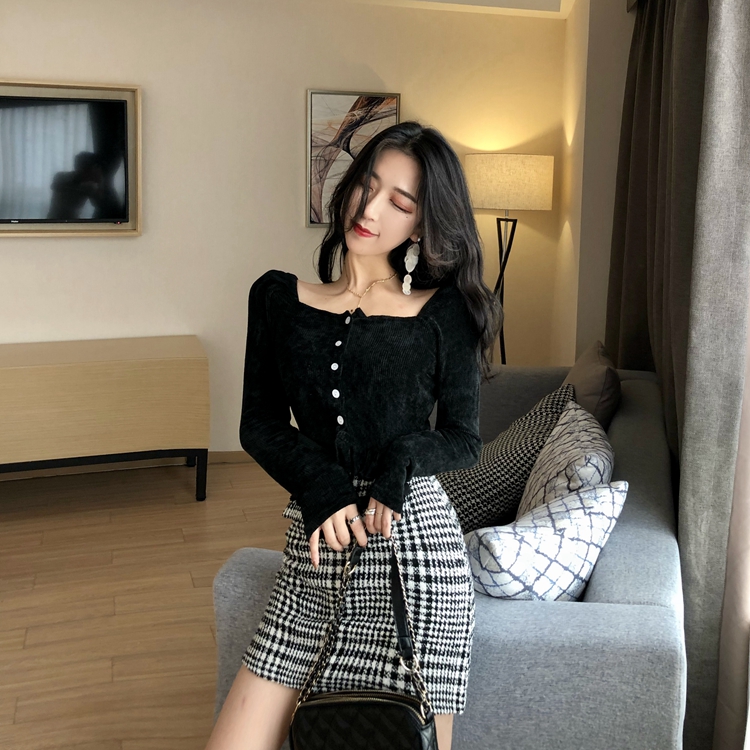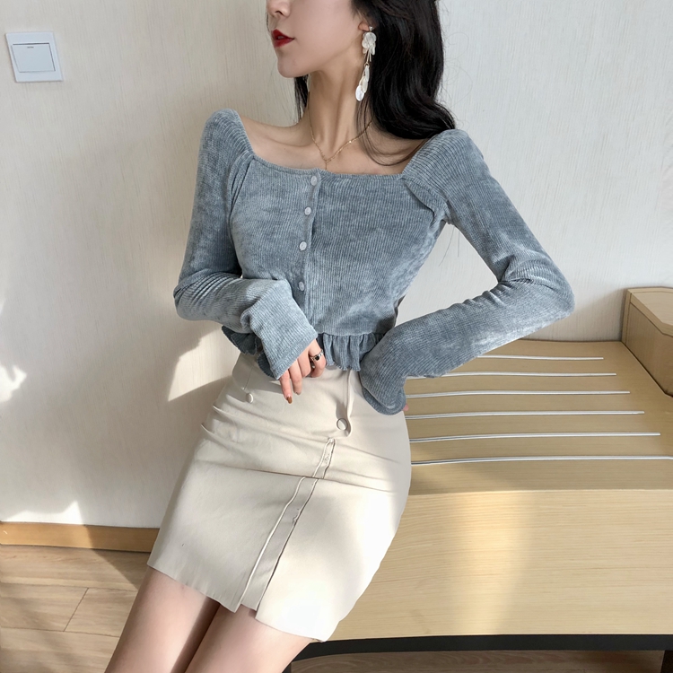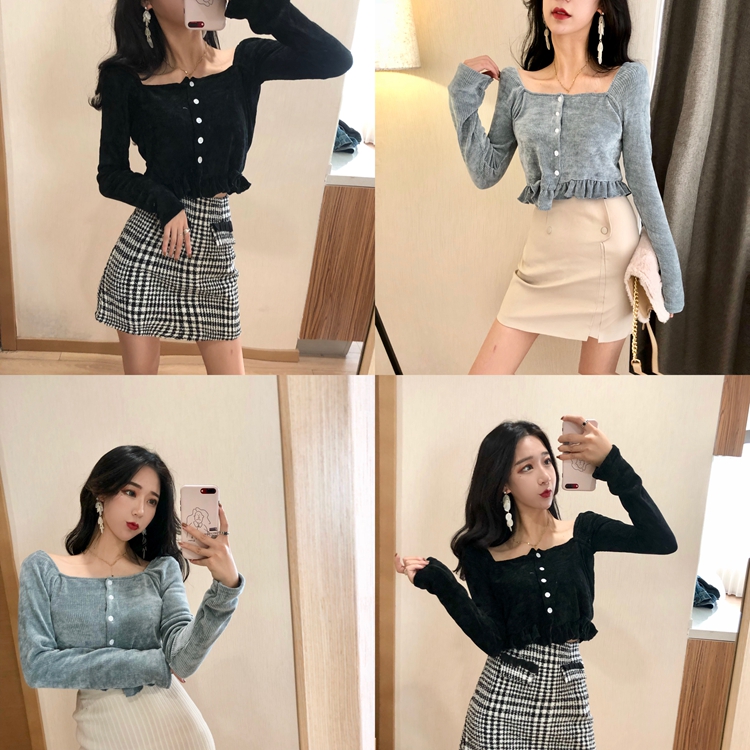 / 長袖新款韓版百搭秋季時尚打底衫上衣方領百搭針織木耳邊內搭T恤