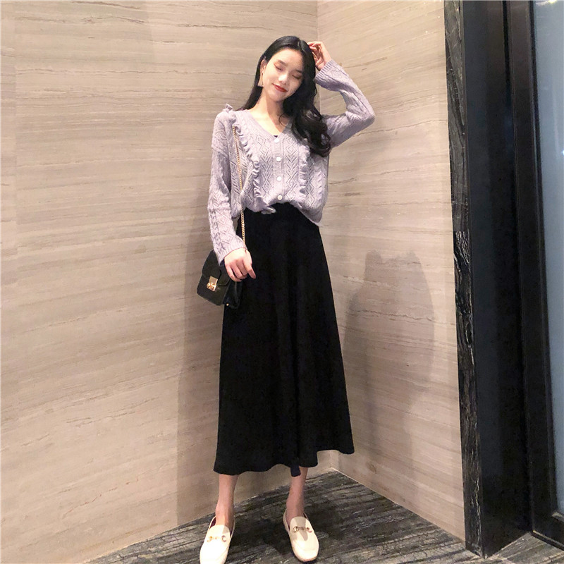 韓國新款復古風木耳邊毛衣開衫外套高腰針織半身裙時尚套裝兩件套