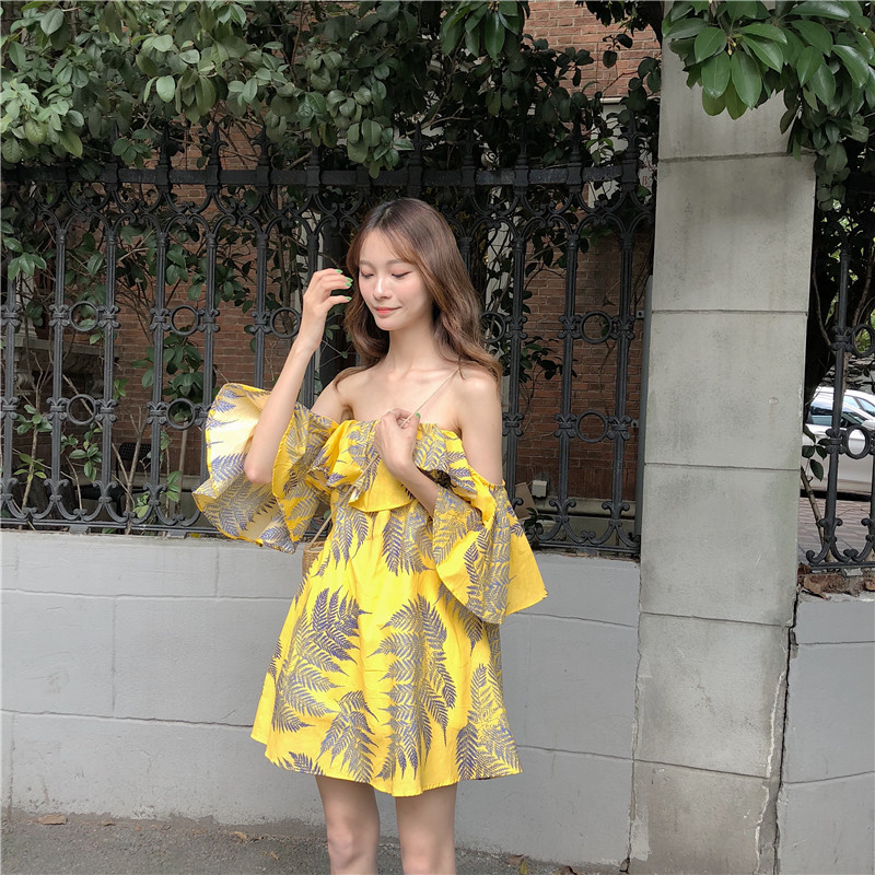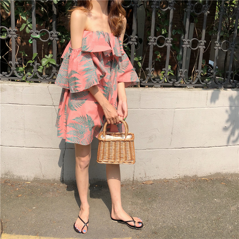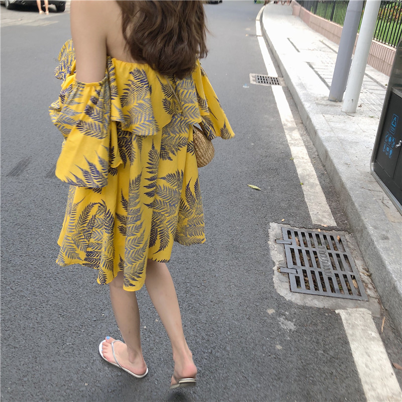 / 夏季新品荷葉邊甜美氣質百搭復古chic時尚一字肩漏肩中長款連衣裙