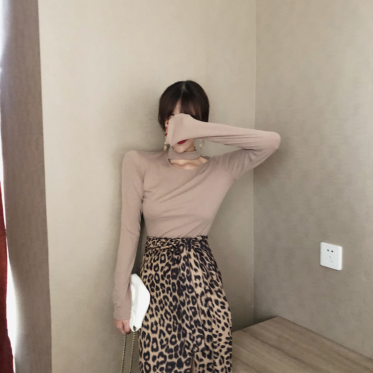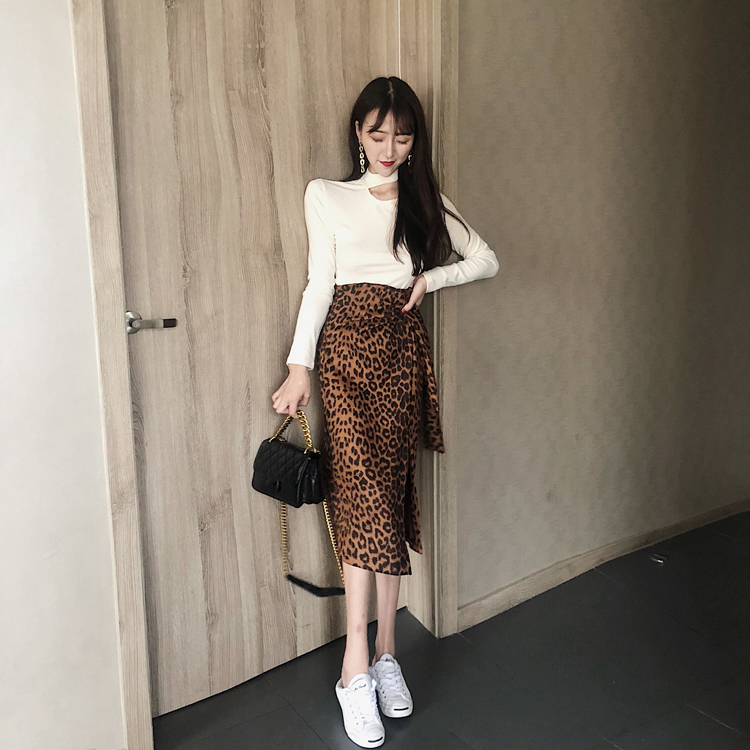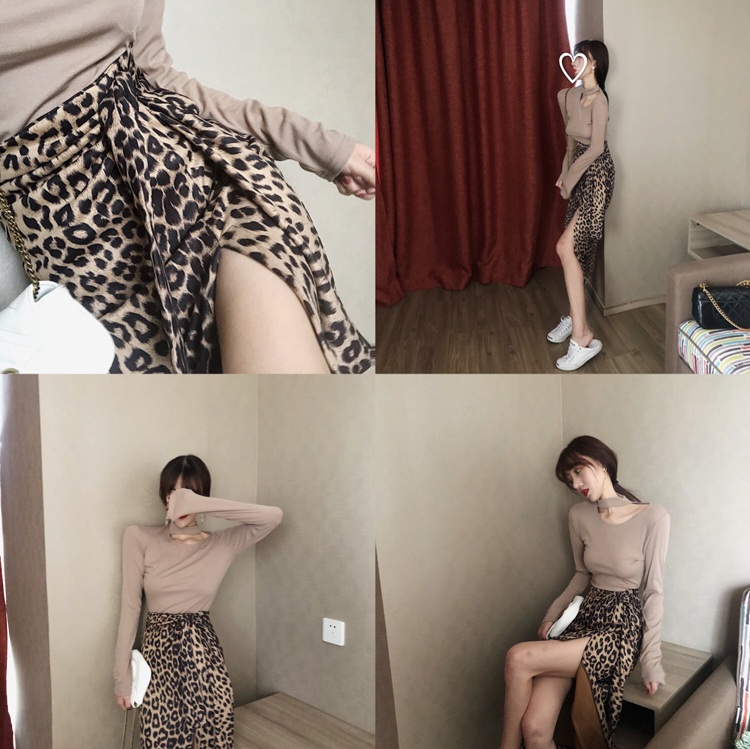 / 港味chic早秋高領彈力打底上衣豹紋開叉半身裙女復古氣質時尚套裝