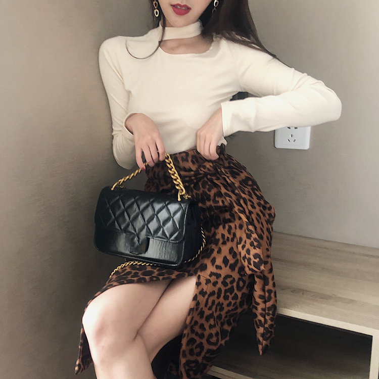 港味chic早秋高領彈力打底上衣豹紋開叉半身裙女復古氣質時尚套裝