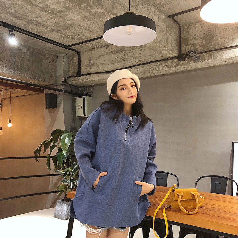 慵懶風寬松純色復古韓版套頭拉鏈連帽衛衣女2018新款大碼顯瘦上衣